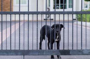 Dog behind a dog-proof fence and gate