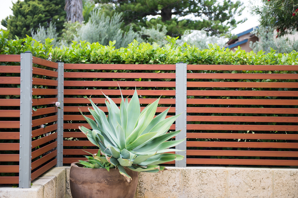 Wood-look aluminium slat fencing with a plant pot in front of it. A timber louvre fence in Perth.